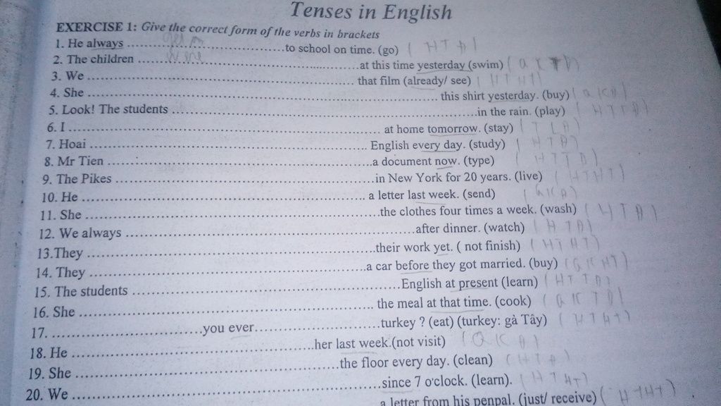 7. studies (Every day -> Hiện tại đơn, do Hoai là tên người nên phải ghi là studies)