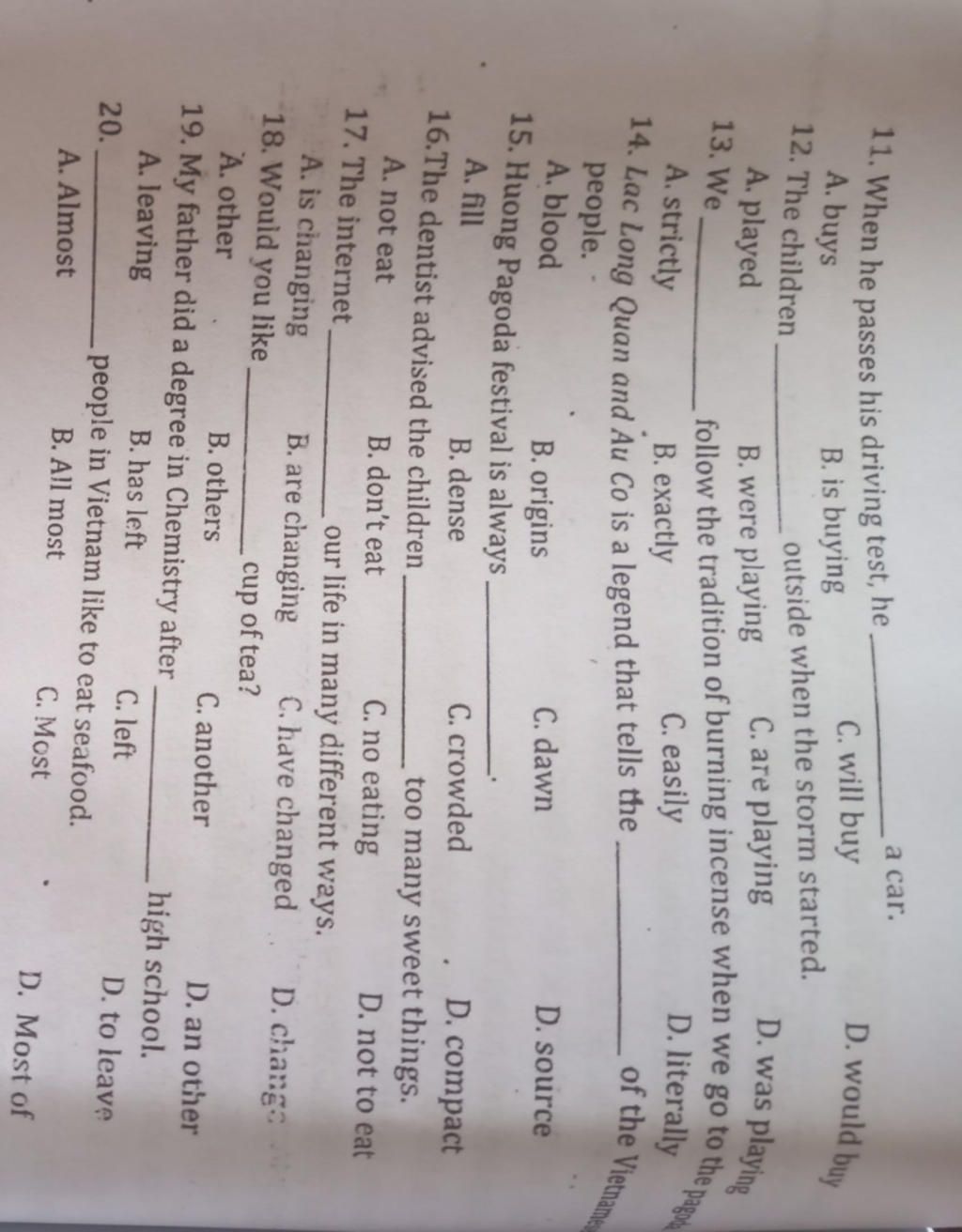 Mình gửi lộn ảnh rồi để mình ghi ,đáp án ra đây Đáp án : C ,B ,A , B, C, D, A, C, A ,A