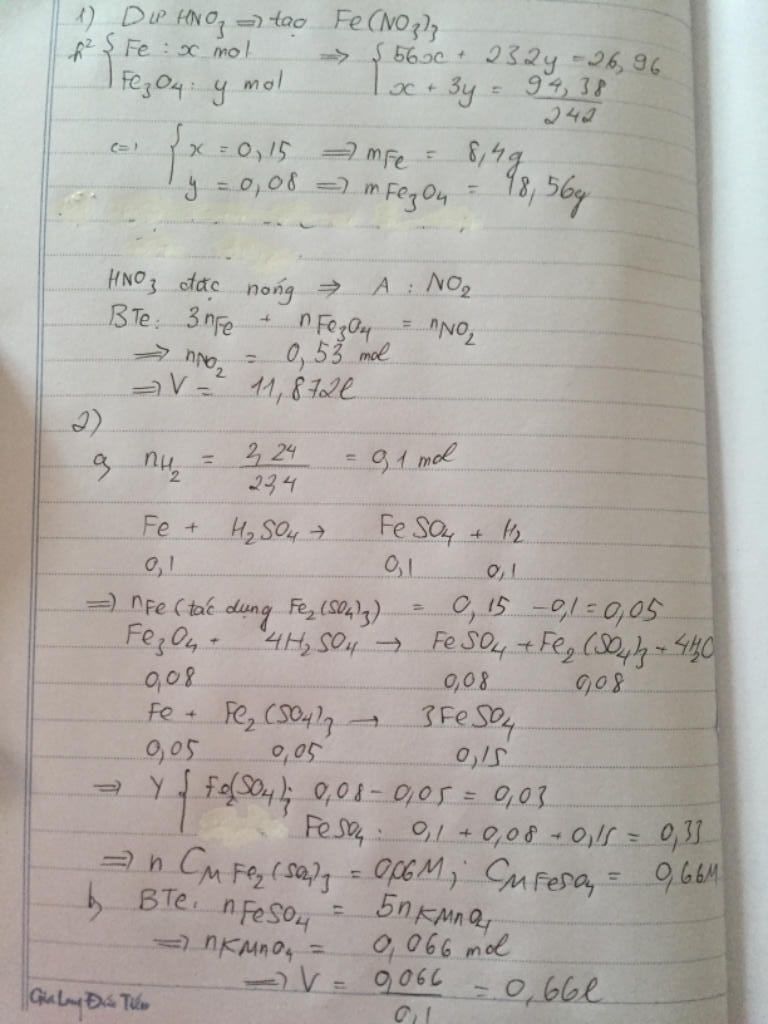2)Cho 26,96g hỗn hợp trên tác dụng với 500ml dung dịch H2SO4 loãng vừa đủ thu được 2,24 lít khí (đktc) và dung dịch Y