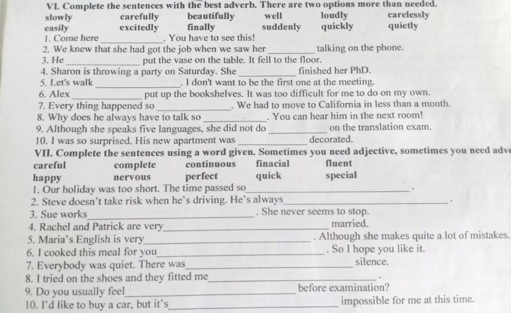 VI. Complete the sentences with the best adverb. There are two options more than needed.