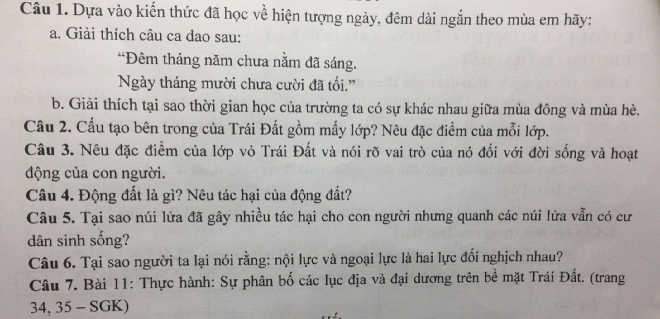 a) - "Đêm tháng 5 chưa nằm đã sáng, ngày tháng 10 chưa cười đã tối". Từ trong thực tế hiện tượng "Ngày dài, đêm ngắn" (tháng 5) và "Ngày ngắn đêm dài" (tháng 10) do ảnh hưởng sự tự quay quanh trục của Trái Đất và chuyển động của TĐ quanh Mặt Trời nên sinh ra hiện tượng ngày đêm chênh lệch giữa 2 nửa cầu và các mùa. - Vào tháng 6 (tháng 5 âm lịch): Do trục TĐ nghiêng và hướng nghiêng ko đổi, ánh sáng Mt chỉ chiếu đc một nửa TĐ (do TĐ hình cầu), nửa cầu Bắc ngả về phía MT nó được chiếu sáng nhiều hơn nửa cầu Nam nân các địa điểm trên nửa cầu Bắc có ngày dài hơn đêm (ngày dài, đêm ngắn).Nước ta nằm ở nửa cầu Bắc do đó đêm tháng 5 ngắn, đúng với câu nói của nhân dân ta:"Đêm tháng 5 chưa nằm đã sáng" - Vào tháng 12( tháng 10 âm lịch): Vào mùa đông, do nửa cầu Bắc chếch xa MT nên các địa điểm trên nửa cầu Bắc có ngày ngắn đêm dài. Nước ta nằm ở nửa cầu Bắc do đó ngày ở tháng 10 ngắn đúng với lời nói " Ngày tháng 10 chưa cười đã tối".