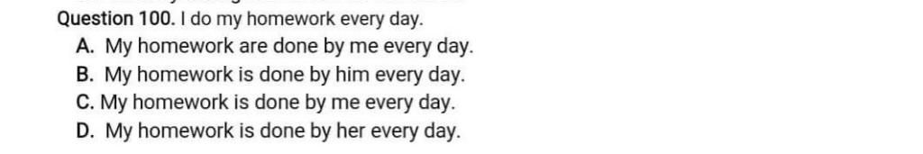 Giải thích: cấu trúc câu bị động ở thì hiện tại đơn ( dấu hiệu nhận biết every day-> hiện tại đơn)
