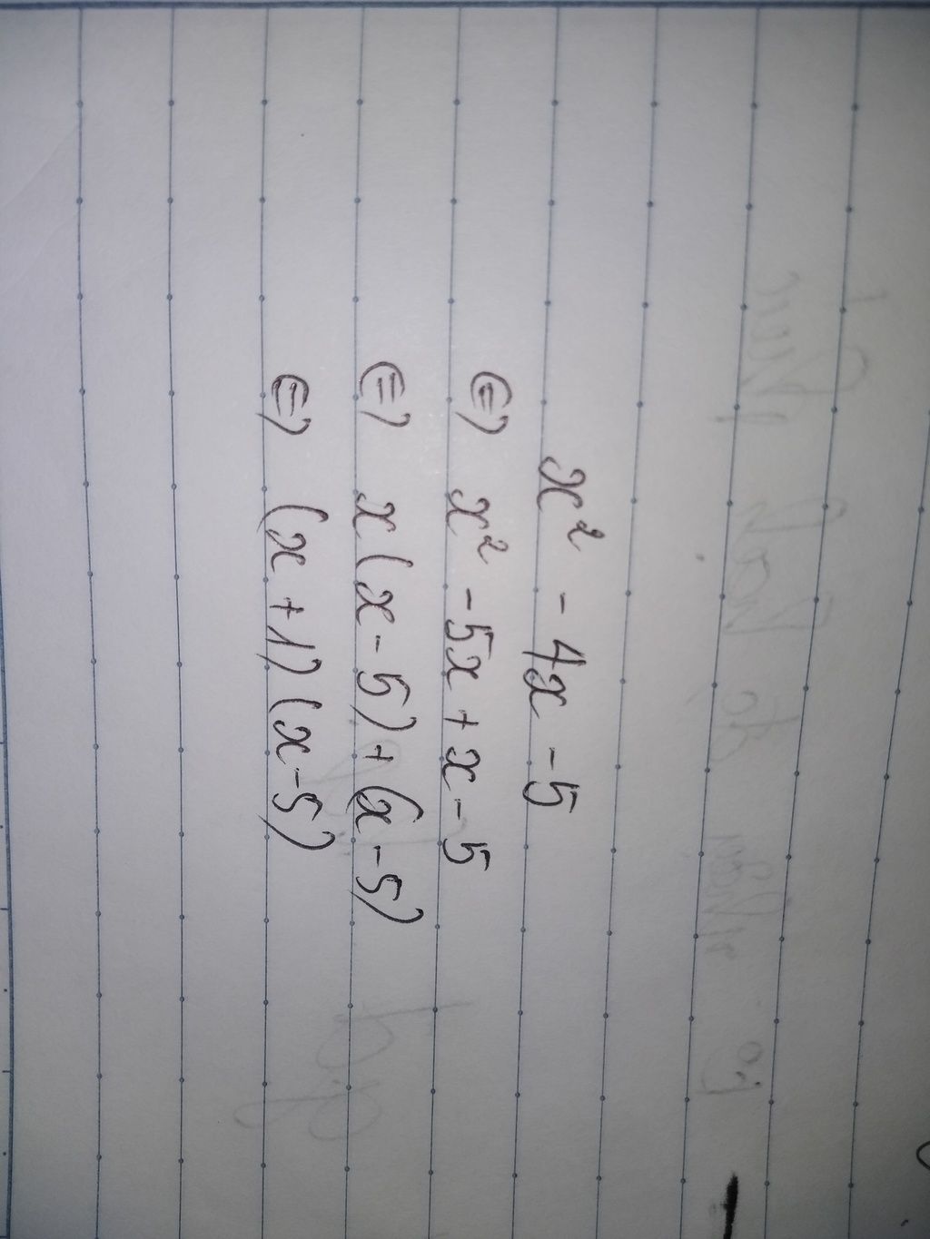 Giải thích các bước giải: ${x^2} - 4x - 5 = {x^2} + x - 5x - 5 = x(x + 1) - 5(x + 1) = (x + 1)(x - 5)$