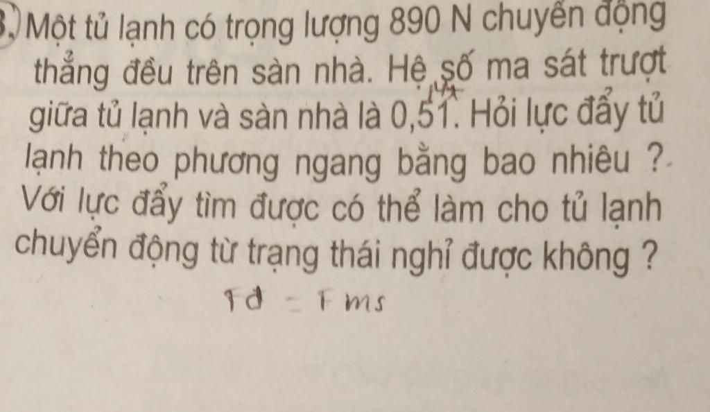 Với lực đẩy này có thể đẩy tủ lạnh chuyển động từ trạng thái nghỉ được.