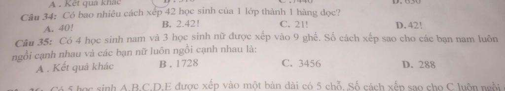 Xếp 42 học sinh của lớp thành 1 hàng dọc có 42! cách
