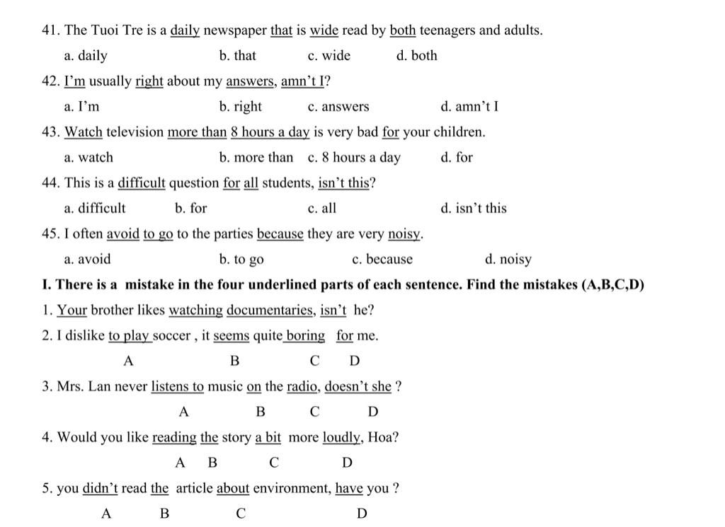 44. d. isn't this → isn't it ( nếu chủ ngữ phần phát biểu là " this " thì chủ ngữ phần đuôi phải là "it "