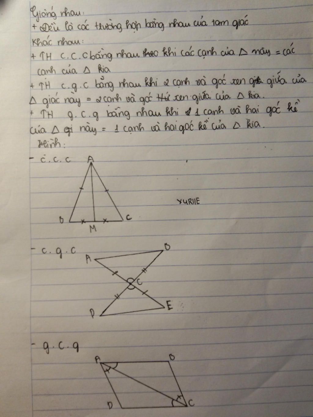 g.c.g : sử dụng 1 cạnh và 2 góc của tam giác , cạnh của tam giác phải nằm xen giữa 2góc .