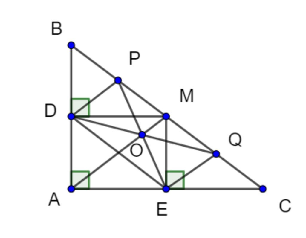 `M, O` lần lượt là trung điểm của `PQ` và `PE`