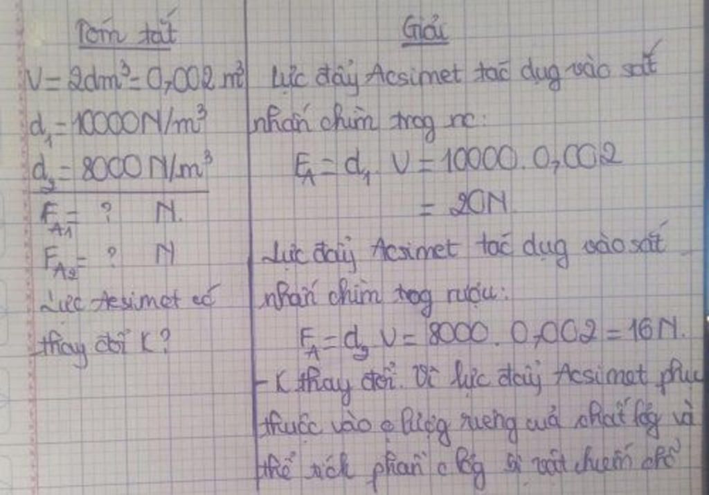 Lực đẩy Ác si mét tác dụng lên miếng sắt trong sắt và rượu là: