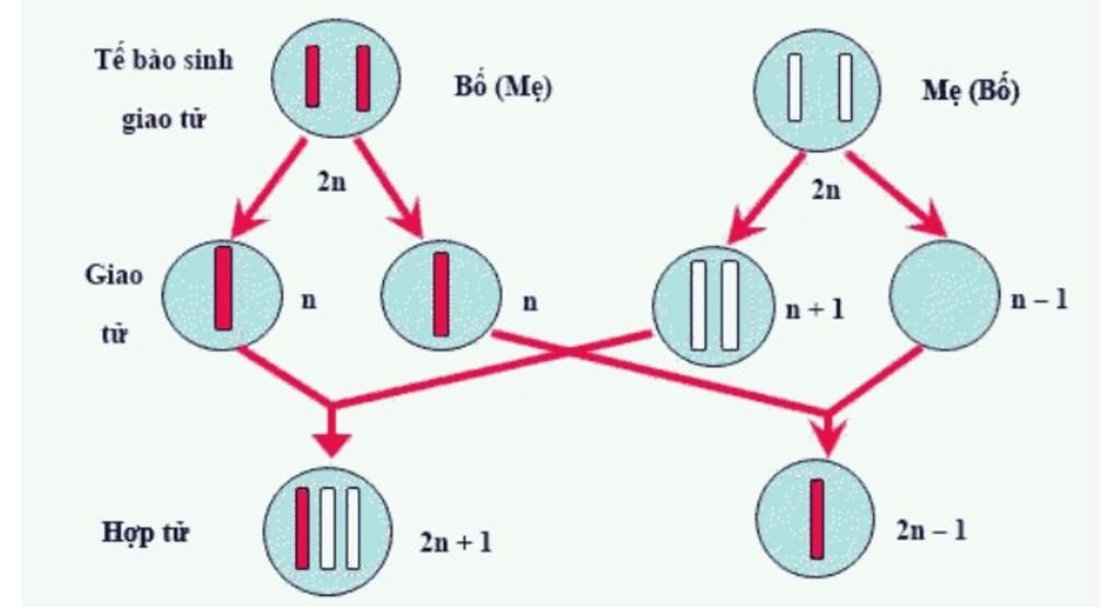 - Khi một cặp NST tương đồng không phân li trong giảm phân ở bố hoặc mẹ → 2 chiếc trong cặp NST tương đồng cùng đi về 1 cực → tạo giao tử bất thường $n+1$ và $n–1$ → qua thụ tinh 2 giao tử đó kết hợp với giao tử bình thường $(n)$ → hợp tử $2n + 1$ và Hợp tử $2n – 1$ → thể dị bội.