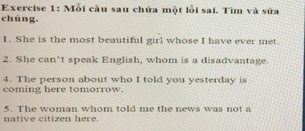 Exercise 1: Mỗi câu sau chứa một lỗi sai. Tìm và sửa