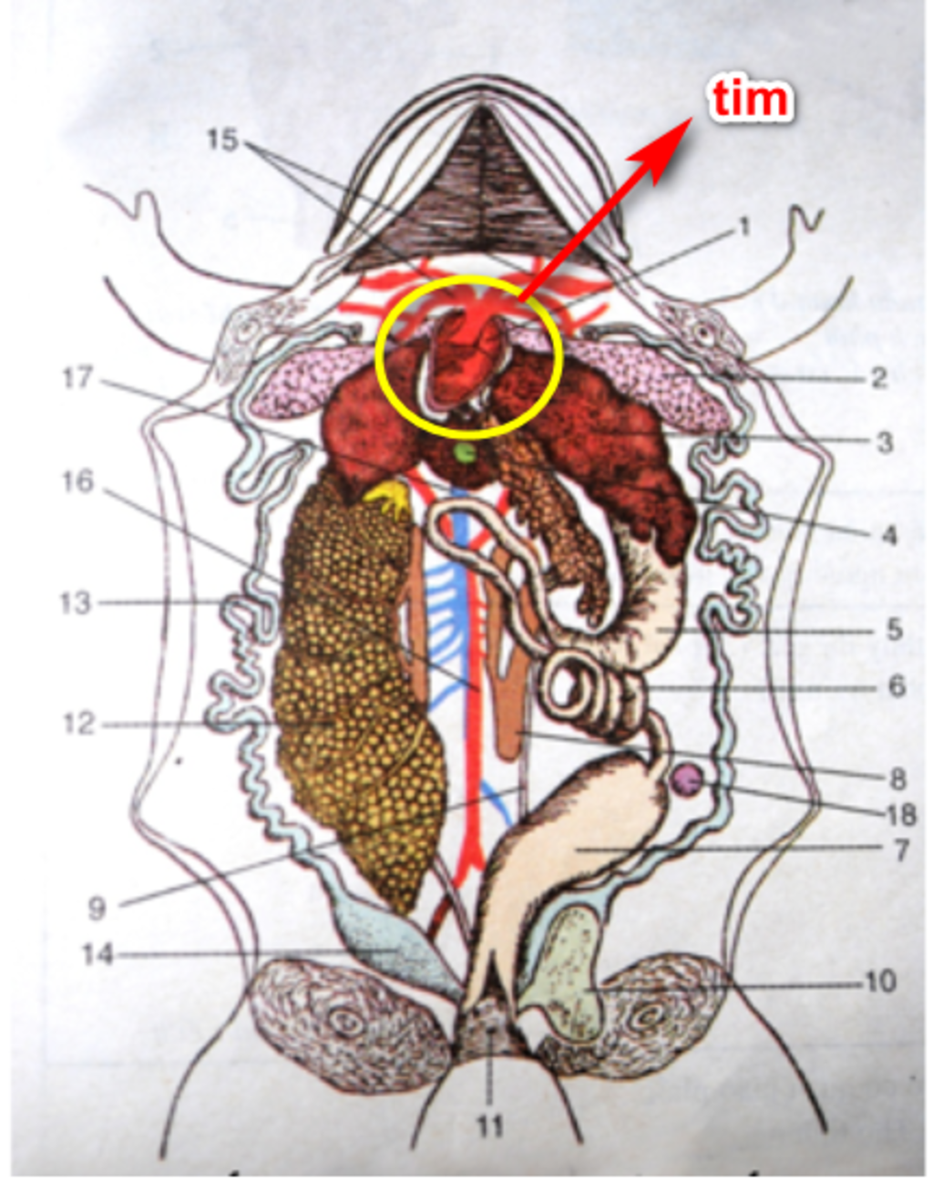 Tim ếch nằm trong lồng ngực, ở vị trí 1/3 thân trên.