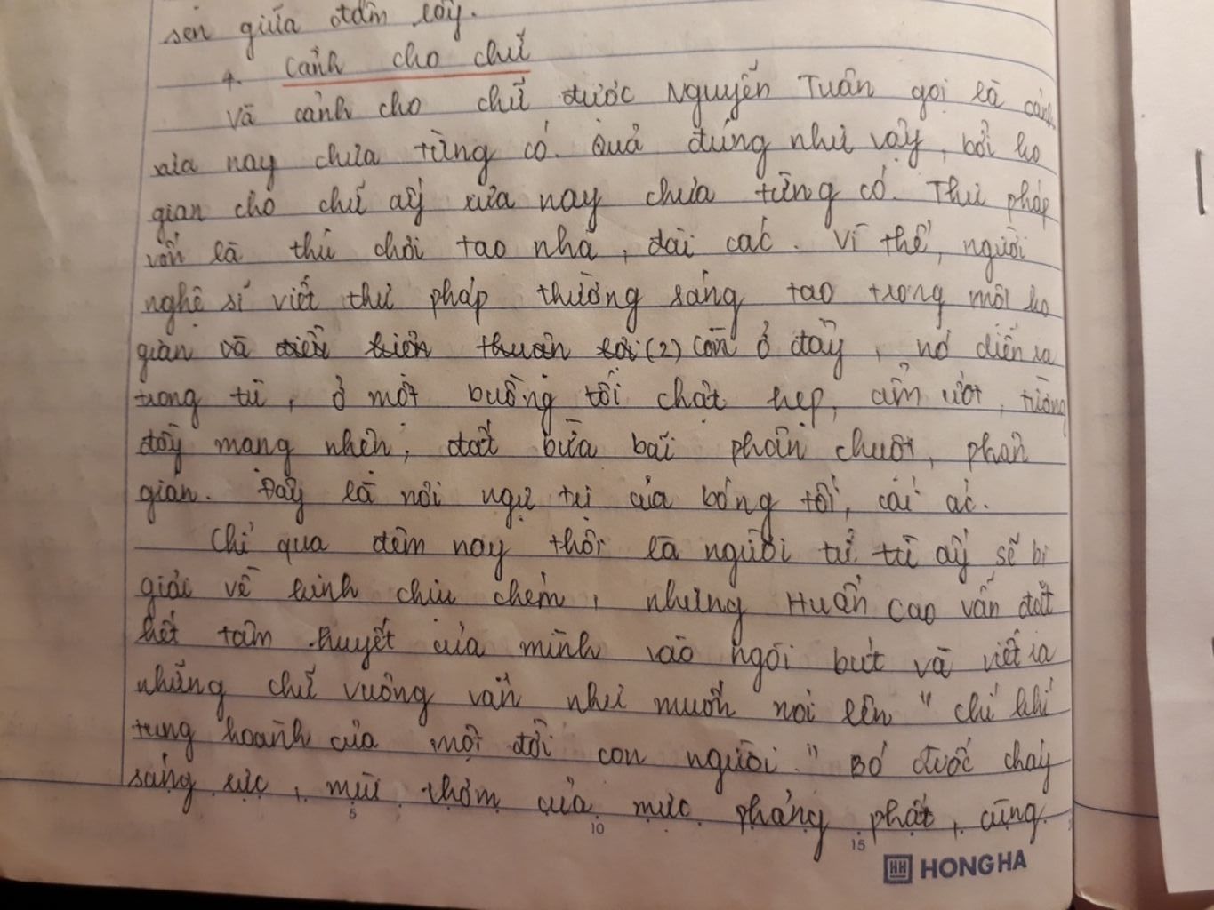 Để khắc hoạ cảnh cho chữ Nguyễn Tuân đã chủ yếu sử dụng nghệ thuật tả cảnh và tả người kết hợp hủ pháp tương phản đối lập . Nghệ thuật dựng ảnh , khắc hoạ tính cách nhân vật , tạo không khí cổ kính , trang trọng , ngôn ngữ giàu tính tạo hình . Đoạn văn tả cảnh Huấn Cao cho chữ có nhịp điệu chậm rãi , câu văn giàu hình ảnh , gợi hình gợi cảm .