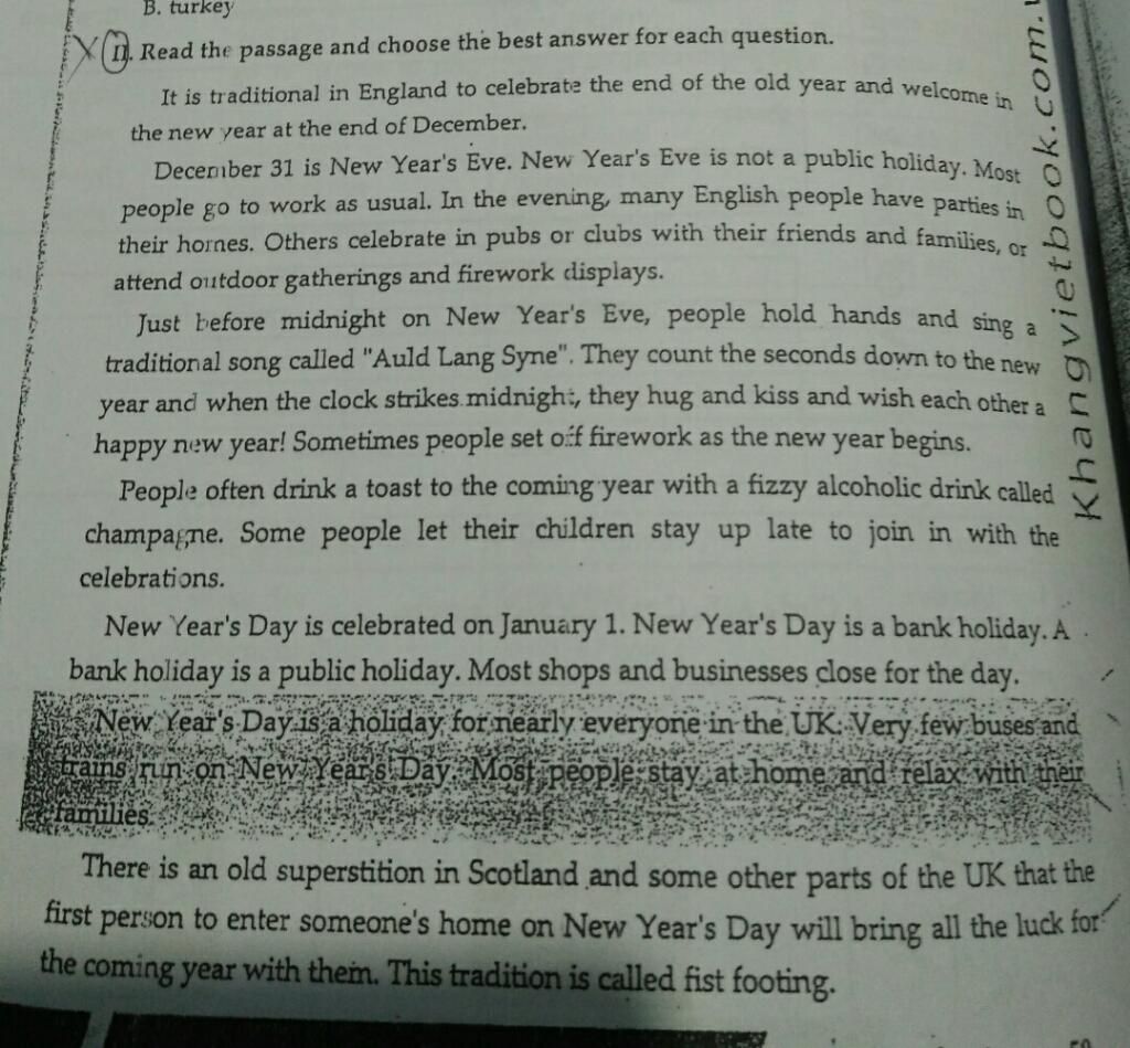New Year's Day is a holiday for nearly everyone in the UK. Very few buses and train run on New Year’s Day. Most people stay at home and relax with their families.