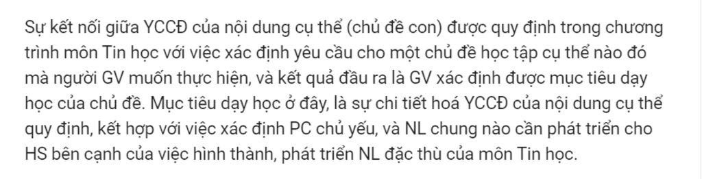 Sự kết nối giữa YCCĐ của nội dung cụ thể (chủ đề con) được quy định trong chương trình môn Tin học với việc xác định yêu cầu cho một chủ đề học tập cụ thể nào đó mà người GV muốn thực hiện, và kết quả đầu ra là GV xác định được mục tiêu dạy học của chủ đề. Mục tiêu dạy học ở đây, là sự chi tiết hoá YCCĐ của nội dung cụ thể quy định, kết hợp với việc xác định PC chủ yếu, và NL chung nào cần phát triển cho HS bên cạnh của việc hình thành, phát triển NL đặc thù của môn Tin học.