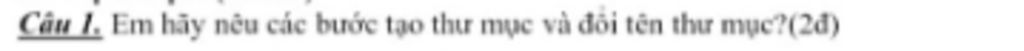 Tạo thư mục: chuột phải>New>Folder Đổi tên thư mục: chuột phải>Rename Xóa thư mục cách 1: bấm 1 lần vào thư mục rồi bấm phím del cách 2: chuột phải>delete Di chuyển thư mục: cách 1: click r kéo thả vào nơi muốn chuyển đến cách 2: chuột phải>Cut>vào nơi mình muốn chuyển đến>Ctrl+V Học tốt nha, cố gằng mai sau làm Developer Rút gọnTạo thư mục: chuột phải>New>Folder Đổi tên thư mục: chuột phải>Rename Xóa thư mục cách 1: bấm 1 lần vào thư mục rồi bấm phím del cách 2: chuột phải>delete Di chuyển thư mục: cách 1: click r kéo thả vào nơi muốn chuyển đến cách 2: chuột phải>Cut>vào nơi... xem thêm