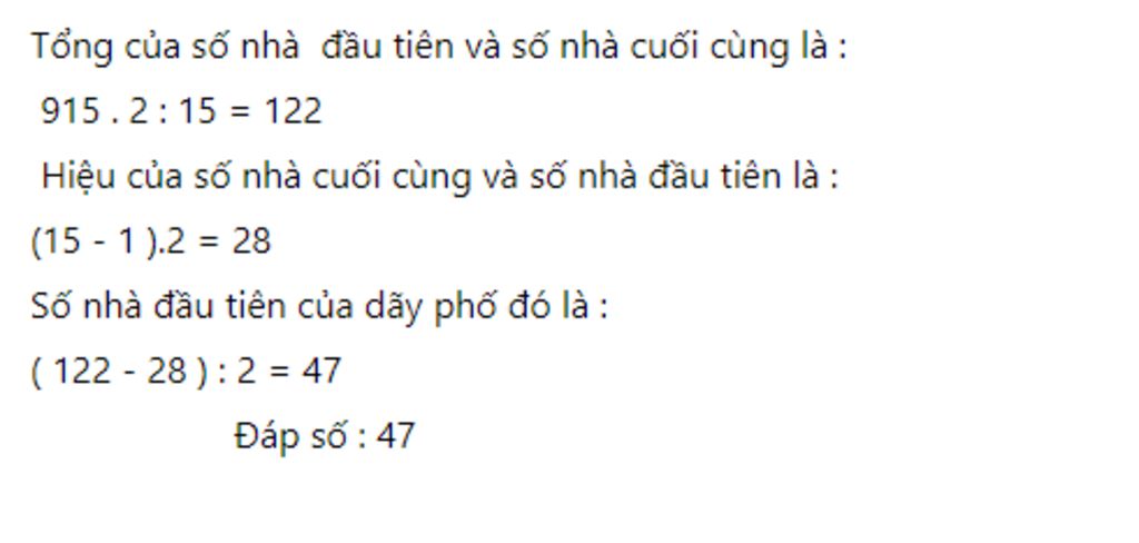 Vậy số nhà đầu tiên của dãy phố là: 47