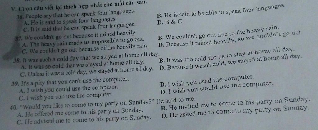 V.Chọn câu viết lại thích hợp nhất cho mỗi câu sau