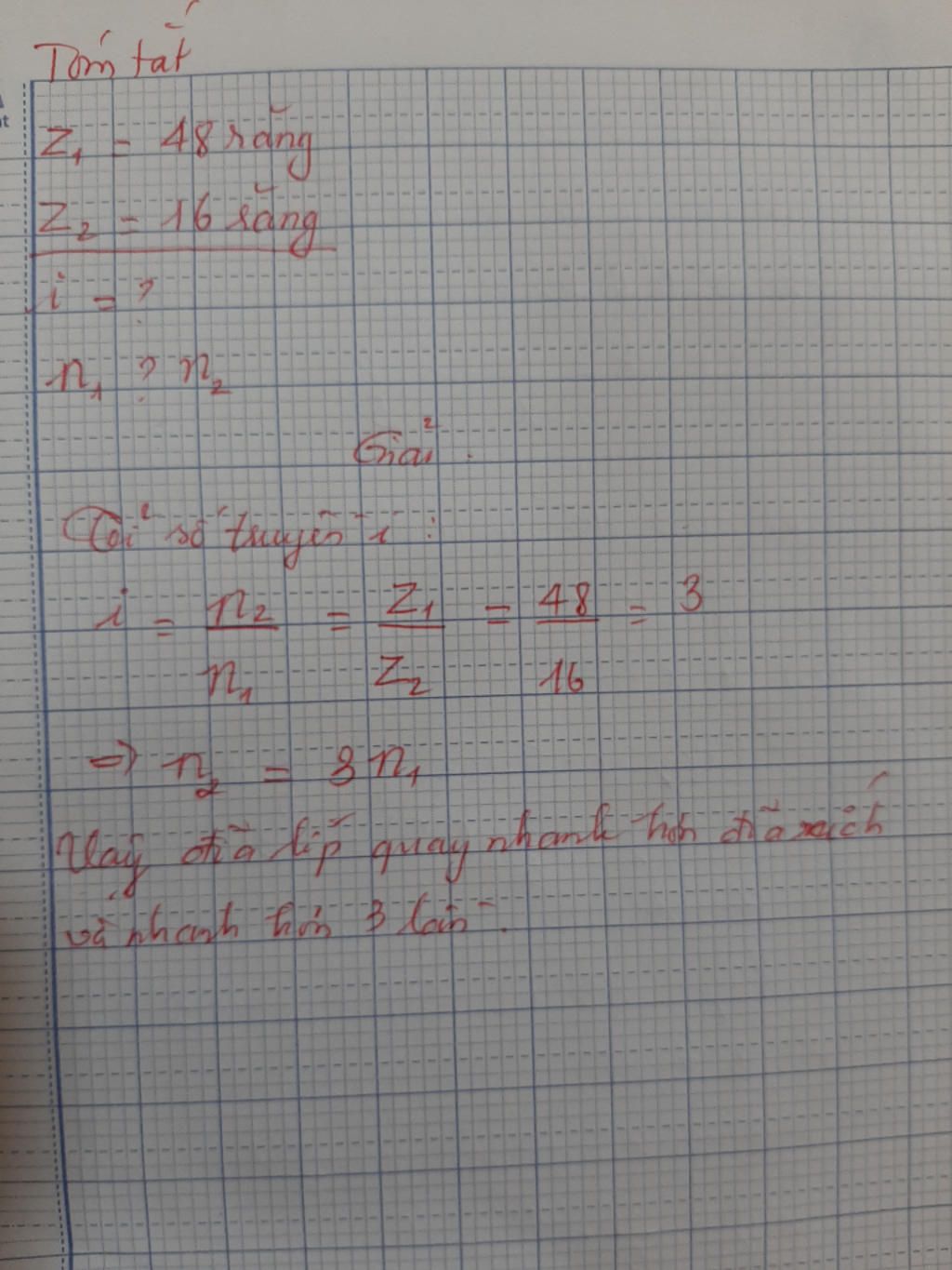 $\begin{array}{l}\rm Tỉ \ số \ truyền \ i \ là:\\\rm i=\dfrac{\rm Z_1}{\rm Z_2}=\dfrac{48}{16}=3\\\to \rm Đĩa \ líp \ quay \ nhanh \ hơn \ đĩa \ xích \ và \ nhanh \ hơn \ 3 \ lần.\end{array}$
