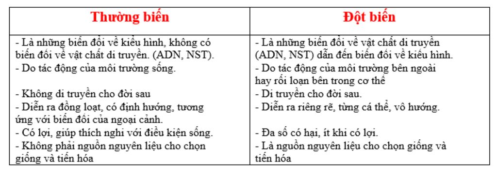 Phân biệt thường biến với đột biến (bảng):