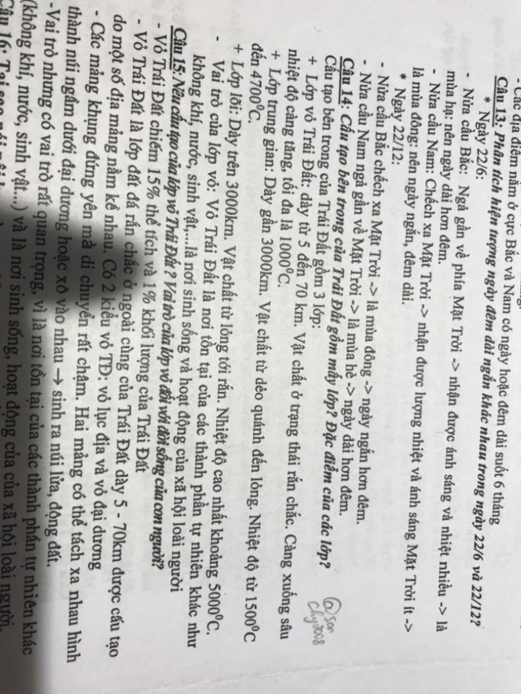 -Lớp vỏ Trái Đất là lớp mỏng nhất có độ dày từ 5km đến 70km. vật chất ở dạng rắn chắc. Lớp vỏ trái đất rất quan trọng vì nó là nơi tồn tại các thành phần tự nhiên của Trái Đất như không khí, nước, sinh vật... đồng thời là nơi tồn tại của xã hội loài người. Lớp vỏ Trái Đất được cấu tạo từ một sổ địa mảng nằm kề nhau. Các địa mảng di chuyển rất chậm chạp. Hai địa mảng kề nhaụ có thể tách xa nhau hoặc xô vào nhau.