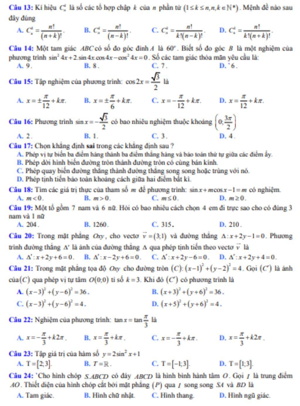 Câu 14: Một tam giác ABC có số đo góc đinh 4 là 60°. Biết số đo góc B là một nghiệm của