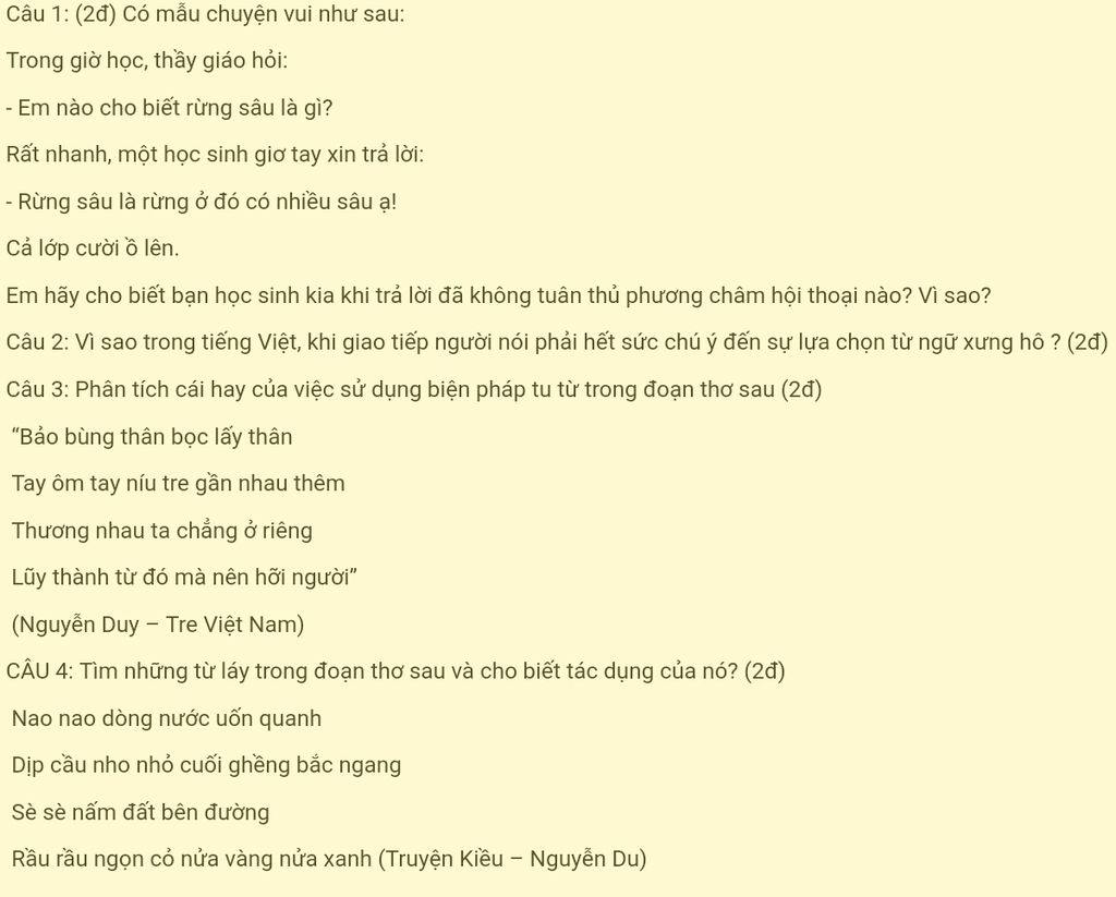 1.Ko tuân thủ phương châm về chất. Vì Thầy giáo hỏi"Rừng sâu là gì" mà học sinh trả lời" rừng có nhiều sâu"
