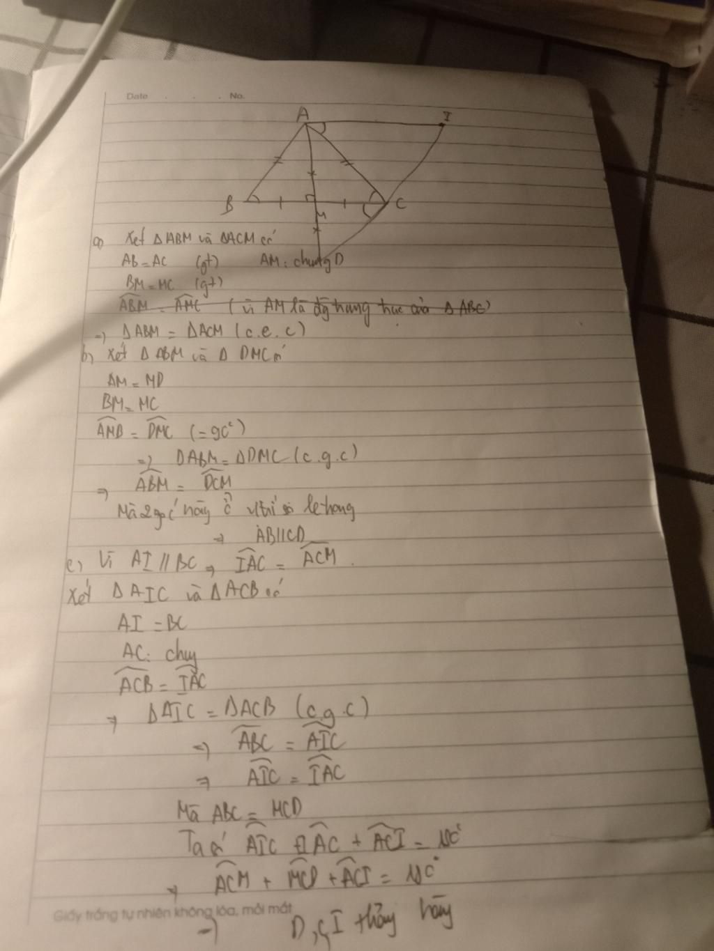 c. Trên nữa mặt phẳng bờ AC không chứa điểm B , vẽ Ax // BC .Lấy điểm I thuộc tia Ax sao cho AI = BC . Chứng minh ba điểm D, C , thẳng hàng