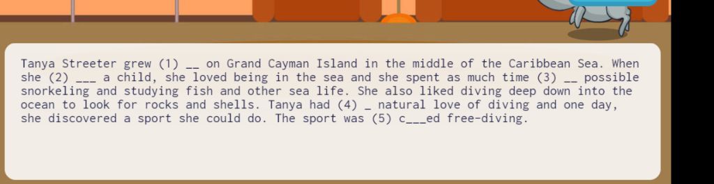 she (2) -- a child, she loved being in the sea and she spent as much time (3) -- possible