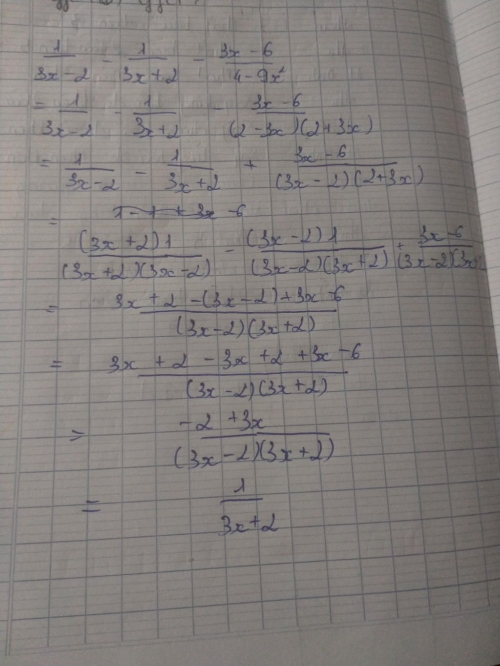 `=1/(3x-2)-1/(3x+2)+(3x-6)/((3x-2)(3x+2))`