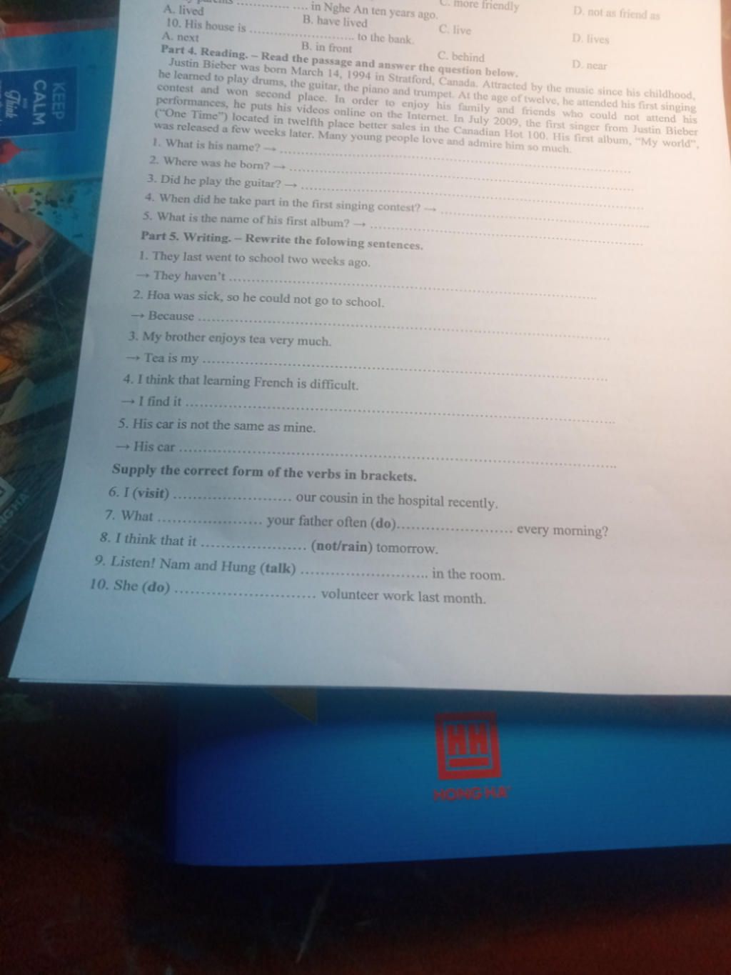 $\text{2.Because Hoa sick,so he couldn't go to school}$