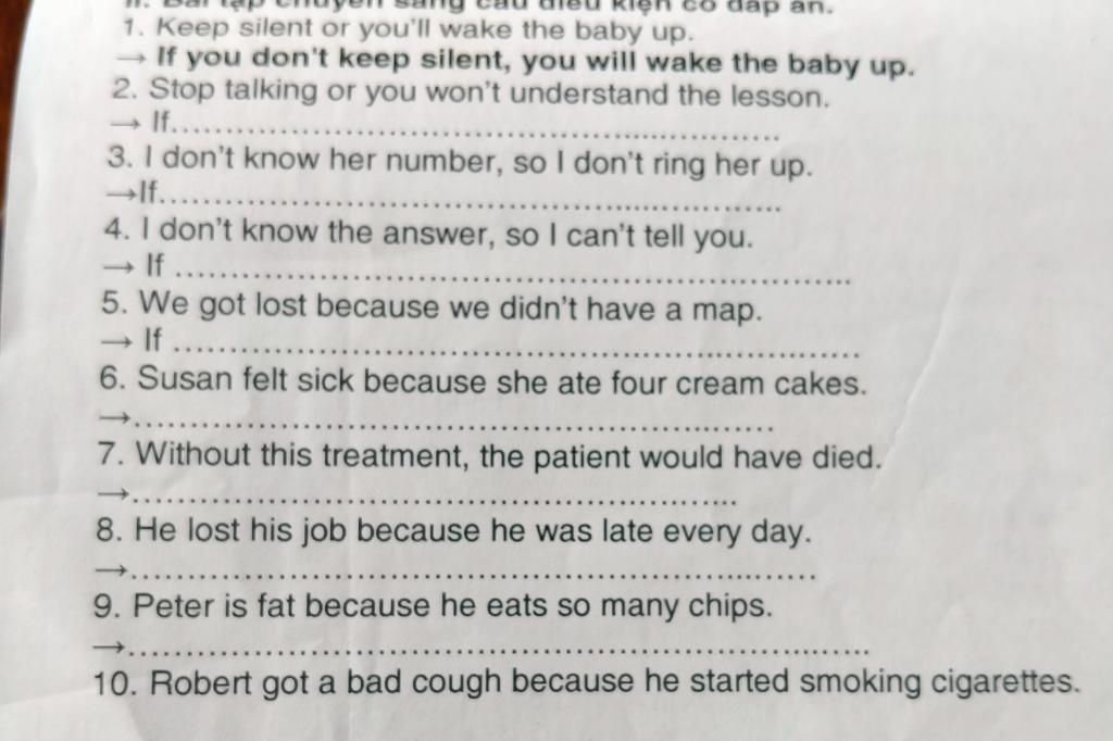$\begin{array}{I}\text{2.If you don't stop talking,you won't understand the lesson.}\\\text{3.If I knew her number,I would ring her up.}\\\text{4.If I knew the answer,I could tell you.}\\\text{5.If we had had a map,we wouldn't have got lost}\\\text{6.If Susan hadn't eaten four cream cakes,she wouldn't have felt sick.}\\\text{7.If the patient hadn't had this treatment,he would have died.}\\\text{8.If he hadn't been late every day,he wouldn't have lost his job.}\\\text{9.If Peter didn't eat so many chips,he wouldn't be fat.}\\\text{10.If Robert hadn't started smoking cigarettes,he wouldn't have got a bad cough.}\end{array}$