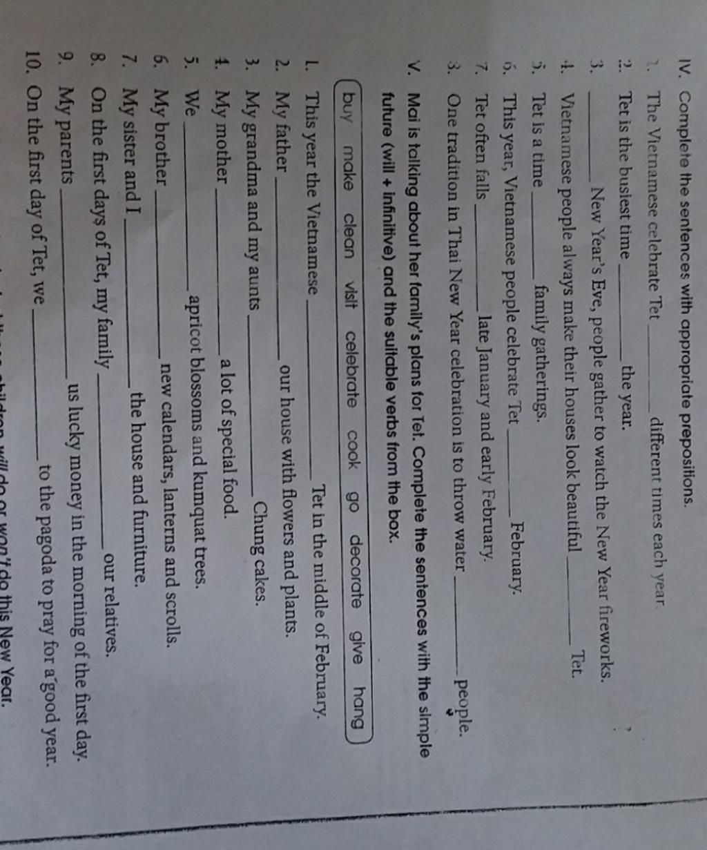 V. Mai is talking about her family's plans for Tet. Complete the sentences with the simple future (will+inf) and the suitable verbs from the box.