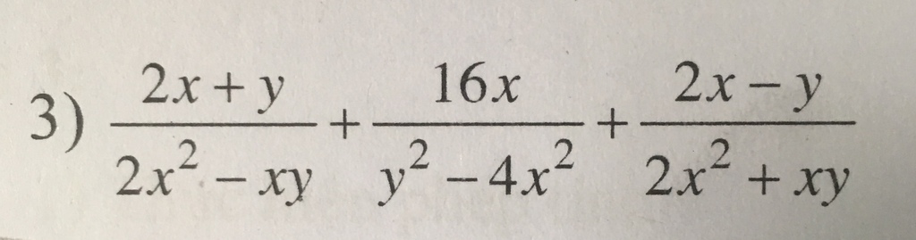 \frac{{2x + y}}{{2{x^2} - xy}} + \frac{{16x}}{{{y^2} - 4{x^2}}} + \frac{{2x - y}}{{2{x^2} + xy}}\\