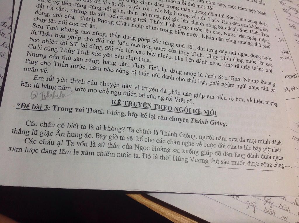 ào đời Hùng Vương thứ 6, sau khi đánh đuổi xong giặc Ân sang xâm lược bờ cõi Văn Lang, ta đã bay về trời. Vừa về tới cổng ta thấy mọi cảnh vật đều rất lạ so với hạ giới. Ngay lúc ấy, ta được vào yết kiến Ngọc Hoàng. Người có hỏi ta: - ở dưới trần gian con khoẻ chứ? Sinh hoạt ở dưới đó ra sao? Cơm ở trần gian có ngon hơn ở trên này không? Cảnh trí dưới đó ra sao, có đẹp bằng thượng giới- không con? - Dạ thưa ngài! ở dưới trần gian cảnh sinh hoạt rất vui, cơm con ăn rất ngon vì các món ăn đều rất lạ miệng. Còn cảnh trí ở trần gian thì thật tuyệt thưa ngài. Đúng là “Sơn thuỷ hữu tình” đấy ạ! - Ô! Thật là tuyệt! Vậy bây giờ con hãy kể chuyện con đánh giặc giúp dân cho ta nghe đi! - Vâng ạ! Thế rồi ta bắt đầu kể: - Thưa ngài! Từ khi ngài sai con xuống trần gian đế làm những việc tốt, con đã đầu thai vào người vợ ông lão có tiếng là phúc đức mà vẫn chưa có con. Song con đã nghĩ ra cách: một hôm con đã đặt một dấu chân rất to ở ngoài đồng để chờ đợi. Đúng như mong ước, hôm ấy bà lão đã đi ra đồng, rồi trông thấy vết chân quá to như vậy, thấy lạ, bà bèn đặt chân lên ướm thử xem chân mình thua kém bao nhiêu. Thế là về nhà ít lâu sau bà thụ thai, rồi mười hai tháng sau con đã ra đời. Nhưng đến năm ba tuổi, con vẫn không đi, không đứng, mà cũng chẳng ngồi, cứ đặt đâu nằm đấy. Năm ấy, lũ giặc Ân tràn sang xâm lược bờ cõi Văn Lang. Thế giặc vô cùng mạnh, đi đến đâu chúng đốt phá nhà cửa, cướp bóc của cải, giết hại dân lành đến đó. Trước tình hình nguy kịch và đau lòng như vậy, nhà vua dưới trần rất lo sợ bèn sai sứ giả đi tìm người hiền tài cứu nước. Khi nghe thấy tiếng loa của sứ giả vang lên ở đầu làng, con bèn ngồi dậy gọi: “Mẹ ơi! Mẹ đi mời sứ giả vào đây cho con.” Thấy con ngồi được, lại nói được, vợ chồng bà lão vừa ngạc nhiên, vừa vui mừng khôn xiết và nhanh chóng gọi ngay sứ giả vào. Sứ giả vừa bước vào tới cửa con nói ngay: Ngươi hãy mau mau về bảo với nhà vua đúc cho ta một con ngựa sắt, một áo giáp sắt, một cái roi sắt, ta sẽ phá tan lũ giặc này. Sứ giả trần gian vô cùng ngạc nhiên, xong đã nhanh chóng về tâu vua. Nhà vua lập tức mời các thợ đúc khéo tay nhất ngày đêm gắng sức làm những thứ mà con dặn. Đồng thời, cũng ngay từ khi gặp sứ giả, con ăn rất khoẻ, lớn nhanh như thổi, cơm cha mẹ con ăn mấy cũng không no, áo vừa may xong đã đứt chỉ. Thấy vậy, cả làng liền góp gạo nuôi con. Mong con mau lớn khoẻ để giết giặc cứu nước. Hôm ấy, giặc đến chân núi Trâu, người của nhà vua cũng vừa kịp tới mang đủ những thứ con cần. Con liền ăn hết bảy nong cơm, ba nong cà, rồi mặc áo giáp sắt, cầm roi sắt, vươn vai biến thành một tráng sĩ oai phong lẫm liệt, vỗ vào mông ngựa, ngựa hí vang. Con nhảy lên lưng ngựa. Xông ra trận, giặc bị con lấy roi sắt quật ngã túi bụi, hồn bay phách lạc, chúng quay đầu bỏ chạy, giẫm đạp lên nhau mà chết. Vừa lúc ấy, roi sắt của con bị gãy, lập tức con nhổ những cụm tre bên đường quật tan lũ giặc. Giặc chết như ngả rạ, đám tàn quân bị con đuối đến chân núi Sóc. Đến đấy, con bèn cởi áo giáp sắt gửi lại trần gian rồi một mình cùng ngựa từ từ bay lên trời. Con chỉ thương hai vợ chồng ông bà lão. Kể đến đây, tôi rất buồn, vẻ mặt buồn hướng xuống trần gian. Thấy thế Ngọc Hoàng hỏi ngay: - Tại sao con ghi được chiến công lớn như vậy lại không ở lại trần gian để được nhân dân tôn sùng, được nhà vua ban thưởng? - Thưa ngài! giúp dân là bổn phận của con. Song việc con sẽ lại về trời để sớm mong được nhận việc mới mà Ngài giao cho ạ! - ồ! Ta rất vui mừng vì con đã có lòng với dân. Bây giờ con hãy đi nghỉ đi, ngày mai ta sẽ ban thưởng cho con. - Đa tạ Ngọc Hoàng! nhưng con muốn xin ngài một điều ạ? -Điều gì vậy? Xin Ngọc Hoàng cho con được một lần nữa xuống thăm lại cha mẹ của con - vợ chồng ông bà lão và xem dân làng còn nhớ và nhận ra con không ạ! - Việc đó con cứ yên tâm, đã có ta lo. Con cứ nghỉ ngơi. Ta sẽ cho người xuống trần gian thăm cha mẹ con và dân làng thay con. - Cảm ơn Ngọc Hoàng! Và thế là Ngọc Hoàng đã sai lính xuống trần gian, và tôi đã được biết rằng nhân dân và nhà vua đã phong cho tôi là Phù Đổng Thiên Vương và lập đền thờ tại quê nhà. Biết được diều này tôi vô cùng sung sướng. Hiện nay đền thờ tôi vẫn còn được bảo tồn ở làng Phù Đổng hay còn gọi là làng Gióng. Vào tháng tư hàng năm, để nhớ công ơn của tôi dân làng đã mở hội to lắm. Còn những bụi tre đăng ngà ở Gia Bình chính vì bị ngựa của tôi phun lửa thiêu cháy nên mới ngả màu vàng như vậy, những hồ ao liên tiếp kia cũng chính là do dấu chân ngựa năm xưa của tôi để lại. Năm ấy khi sông trận giết giặc ngựa của tôi hí vang trời, phun lửa và đã thiêu cháy một làng, cho nên sau này hạ gi