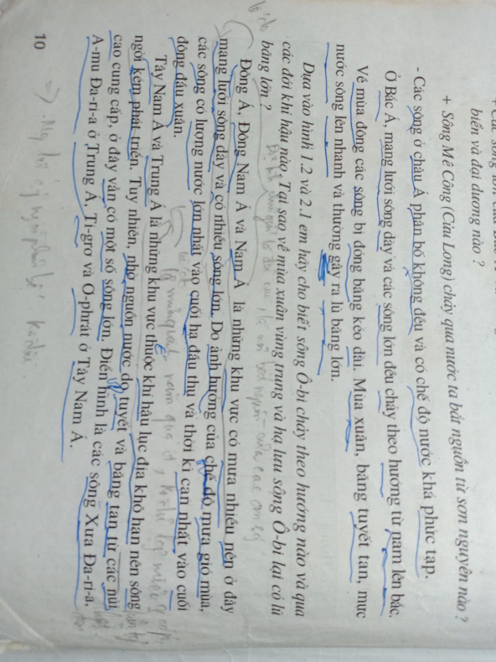 - Đông Á, Đông Nam Á và Nam Á là những khu vực có mưa nhiều nên ở đây mạng lưới sông dày và có nhiều sông lớn. Do ảnh hưởng của chế độ mưa gió mùa, các sông có lượng nước lớn nhất vào cuối hạ đầu thu và thời kì cạn nhất vào cuối đông đầu xuân.