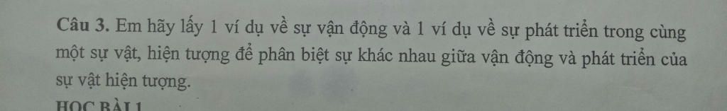 => Hiện tượng để phân biệt: Sự vận động không gây biến đổi bản chất hạt lúa, hạt lúa vẫn là hạt lúa. Sự phát triển gây ra biến đổi bản chất hạt lúa, hạt lúa không còn là hạt lúa mà thành cây mạ, cây lúa. Tương tự các sự vật khác cũng vây. Sự vận động không gây biến đổi bản chất sự vật, còn sự phát triển làm thay đổi bản chất của sự vật (theo đổi theo chiều hướng tích cực thì được gọi là phát triển).
