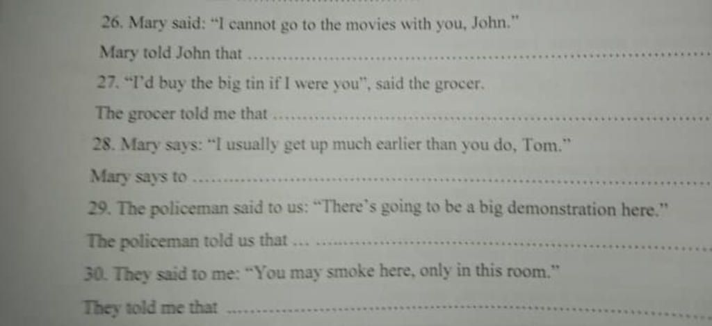 $\begin{array}{I}\text{26.Mary told John that she couldn't go to the movies with him.}\\\text{27.The grocer told me that he'd buy the big tin if he were me.}\\\text{28.Mary says to Tom that she usually gets up much earlier than he does.}\\\text{29.The police told us that there was going to be a big demonstration there.}\\\text{30.They told me that I might smoke there,only in that room.}\end{array}$