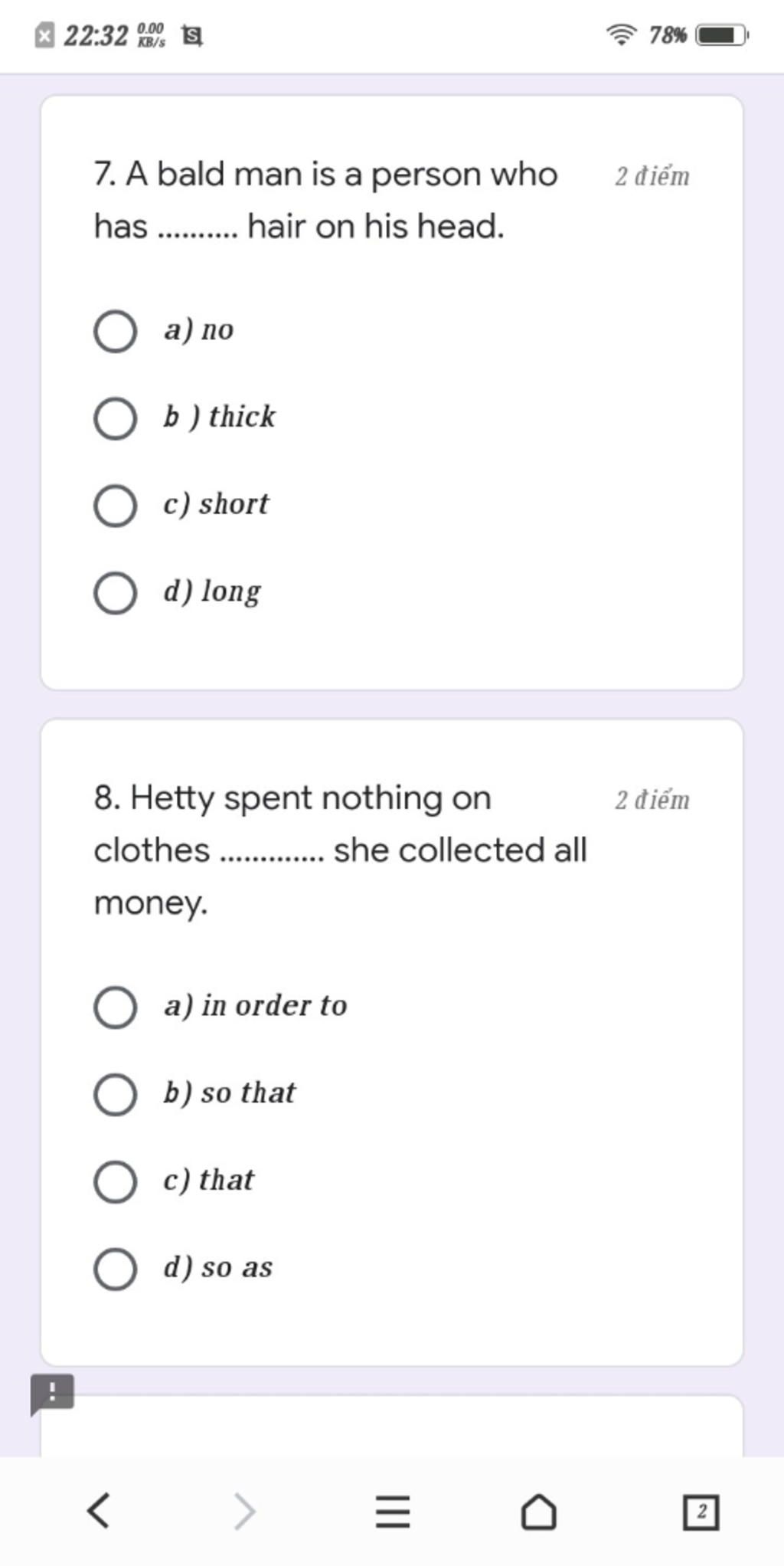 7a (bald: hói, ý cả câu: một người hói là người không có tóc trên đầu-> no hair