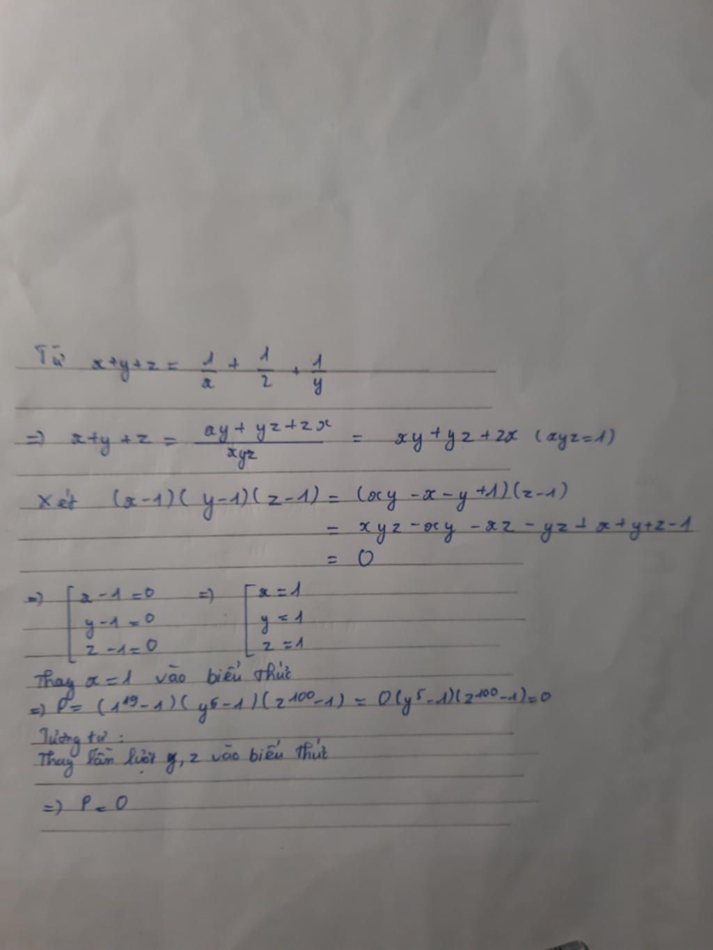 Xét tích : (x - 1)(y - 1)(z - 1) = (xy - x - y +1)(z - 1) = xyz - xy - xz - yz + x + y + z - 1 = 0