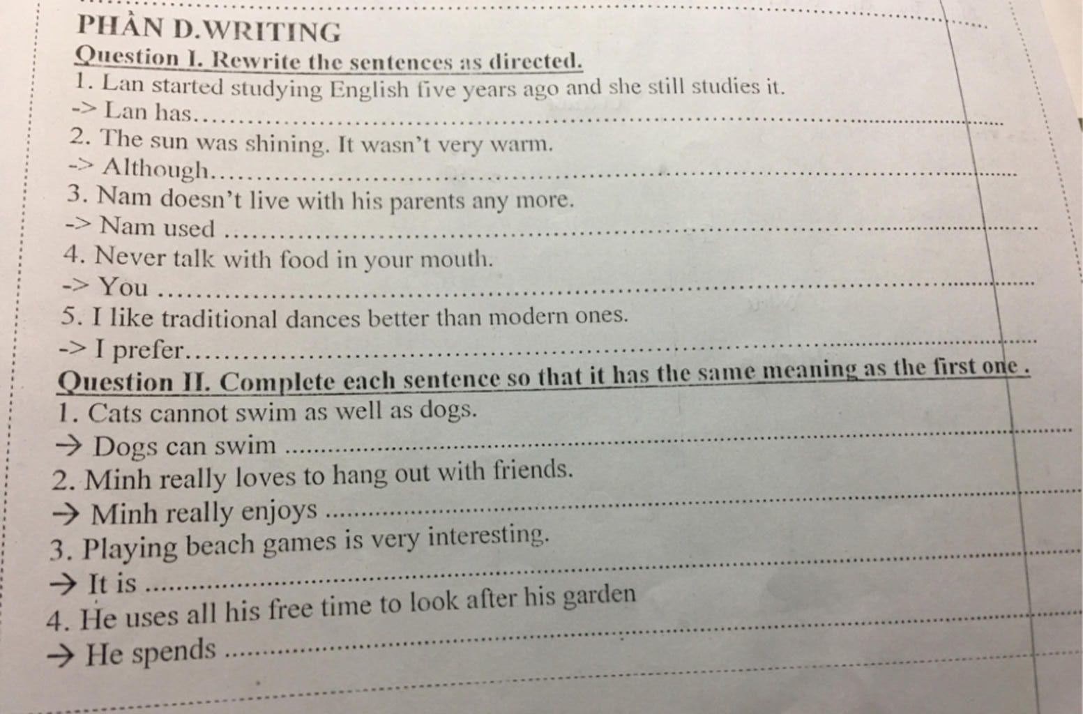 $\begin{array}{I}I.\\\text{1.Lan has studied English for 5 years.}\\\text{2.Although the sun was shinning,it wasn't very warm.}\\\text{3.Nam used to live with his parents.}\\\text{4.You mustn't talk with food in your mouth.}\\\text{5.I prefer traditional dances to modern ones.}\\II.\\\text{1.Dogs can swim better than cats.}\\\text{2.Minh really enjoys hanging out with his friends.}\\\text{3.It is very interesting to play beach games.}\\\text{4.He spends all his free time looking after his garden.}\end{array}$