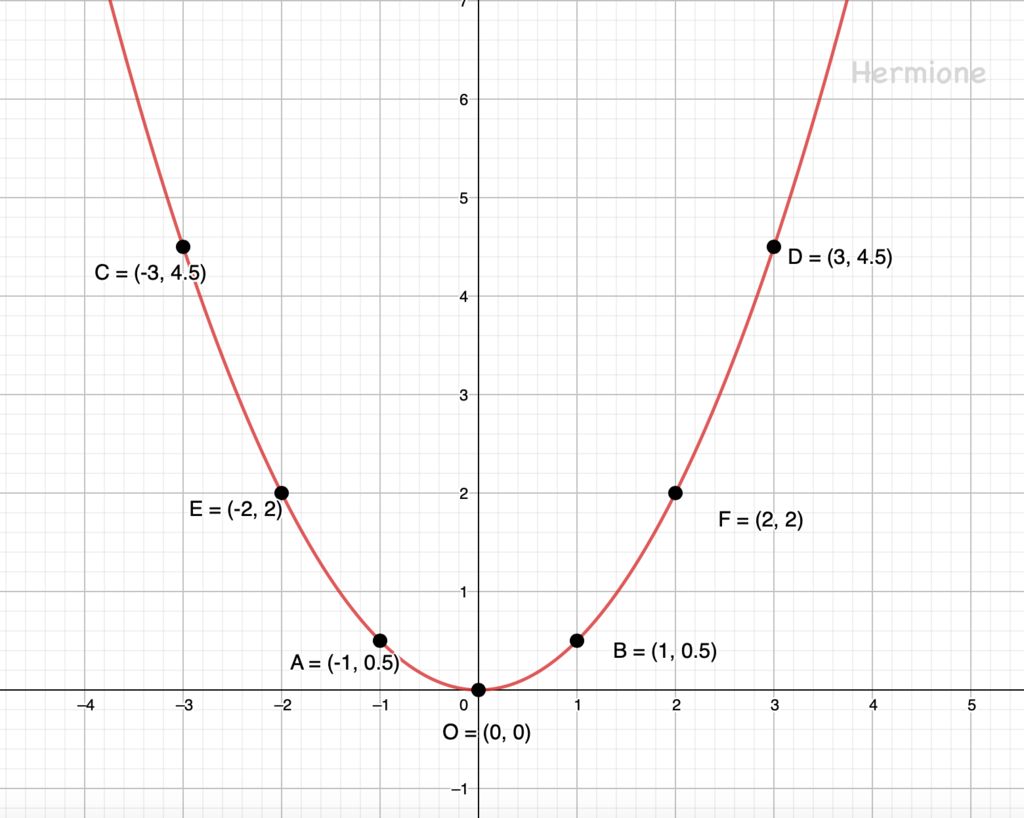 `-` Nối các điểm lại `->` Ta được đồ thị `(P): y=1/2x^2`