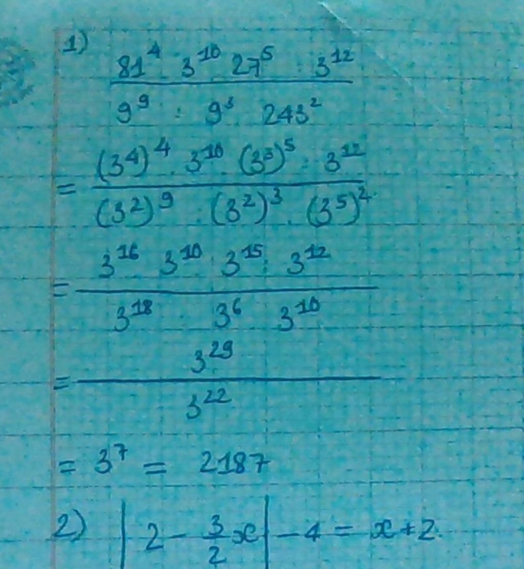 `=((3^4)^4. 3^10. (3^3)^5 :3^12)/((3^2)^9 :(3^2)^3. (3^5)^2)`