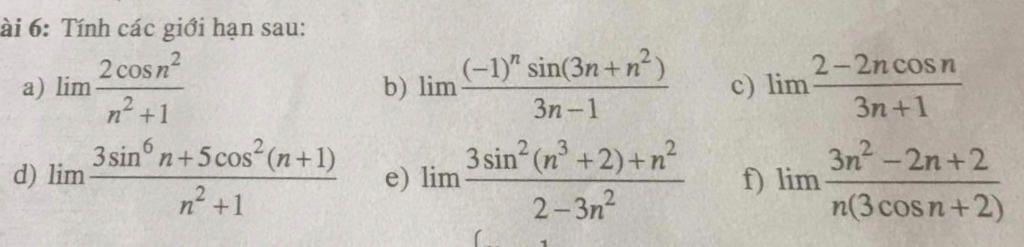 $\to \lim\dfrac{3\sin^2(n^3+2)+n^2}{2-3n^2}=\lim\dfrac{n^2}{2-3n^2}=\lim\dfrac{1}{\dfrac{2}{n^2}-3}=\dfrac{-1}{3}$