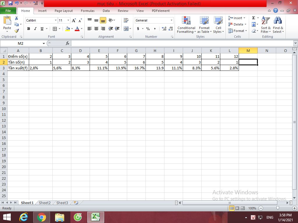 \begin{array}{|c|c|c|}\hline \text{Điểm số}&\text{Tần số}&\text{Tần suất}\\\hline \text{2}&\text{1}&\text{2,8%}\\\hline \text{3}&\text{2}&\text{5,6%}\\\hline \text{4}&\text{3}&\text{8,3%}\\\hline \text{5}&\text{4}&\text{11,1%}\\\hline \text{6}&\text{5}&\text{13,9%}\\\hline \text{7}&\text{6}&\text{16,7%}\\\hline \text{8}&\text{5}&\text{13,9%}\\\hline \text{9}&\text{4}&\text{11,1%}\\\hline \text{10}&\text{3}&\text{8,3%}\\\hline\hline \text{11}&\text{2}&\text{5,6%}\\\hline \text{12}&\text{1}&\text{2,8%}\\\hline \end{array}