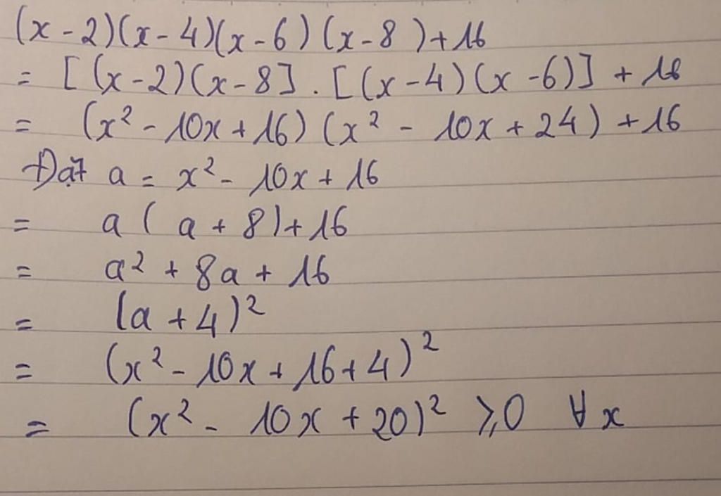 Vậy $(x-2)(x-4)(x-6)(x-8) +16\geq 0\quad \forall x$