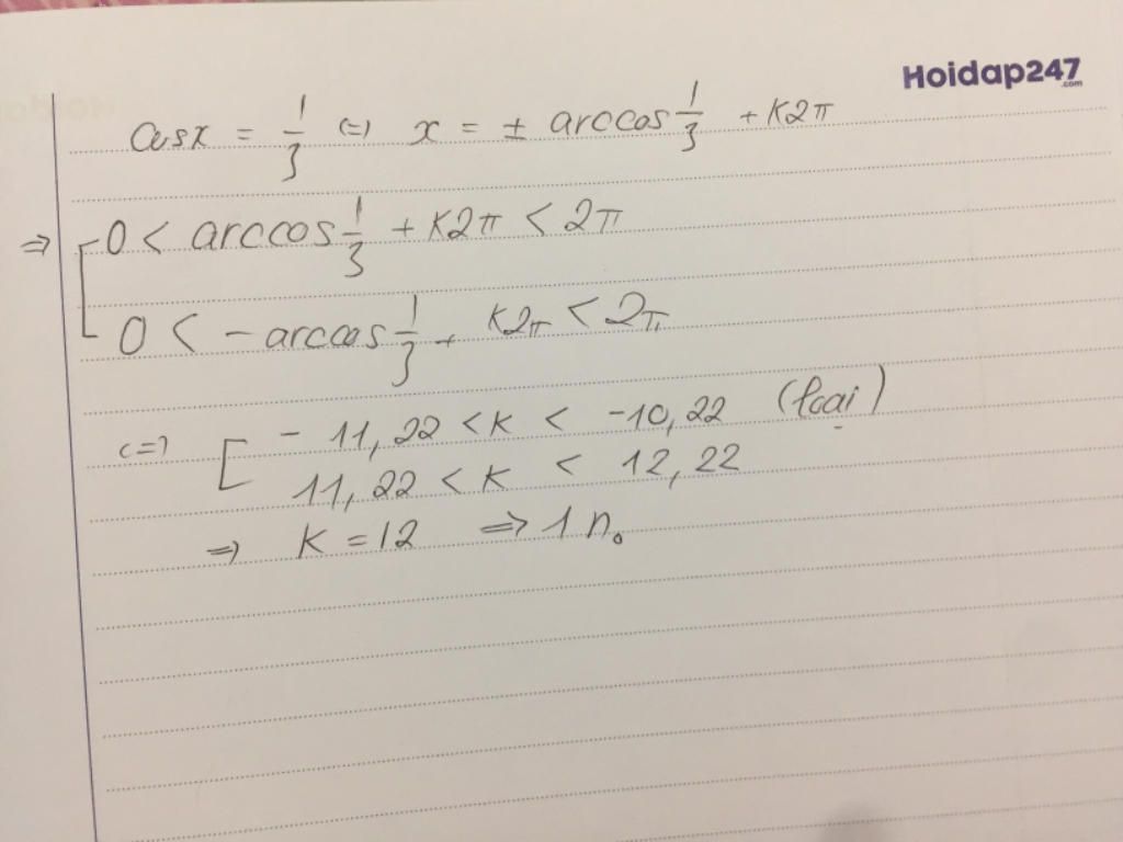 $\to \left[\begin{array}{l}0 < \arccos\dfrac13 + k2\pi< 2\pi\\0 < -\arccos\dfrac13 + k2\pi < 2\pi\end{array}\right.$