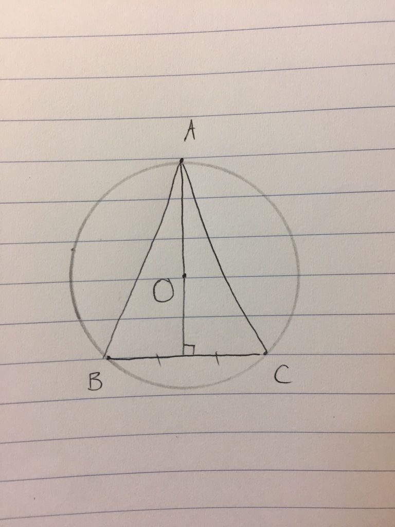 Vậy bạn vẽ tam giác cân. Vẽ 2 đường trung trực của tam giác. Giao 2 đường đấy là tâm đường tròn ngoại tiếp