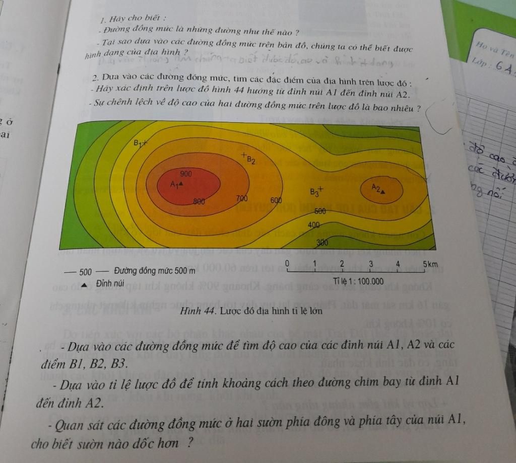 - Dựa vào các đường đồng mức để tìm độ cao của các đỉnh núi A1, A2 và các điểm Bl, B2, B3.