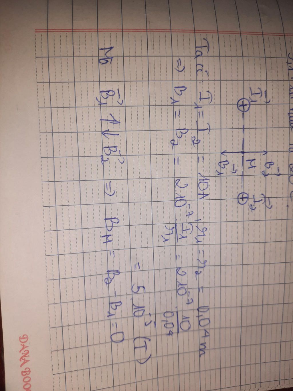 \({B_1} = {B_2} = {2.10^{ - 7}}\dfrac{{{I_1}}}{{{r_1}}} = {2.10^{ - 7}}\dfrac{{10}}{{0,04}} = {5.10^{ - 5}}T\)